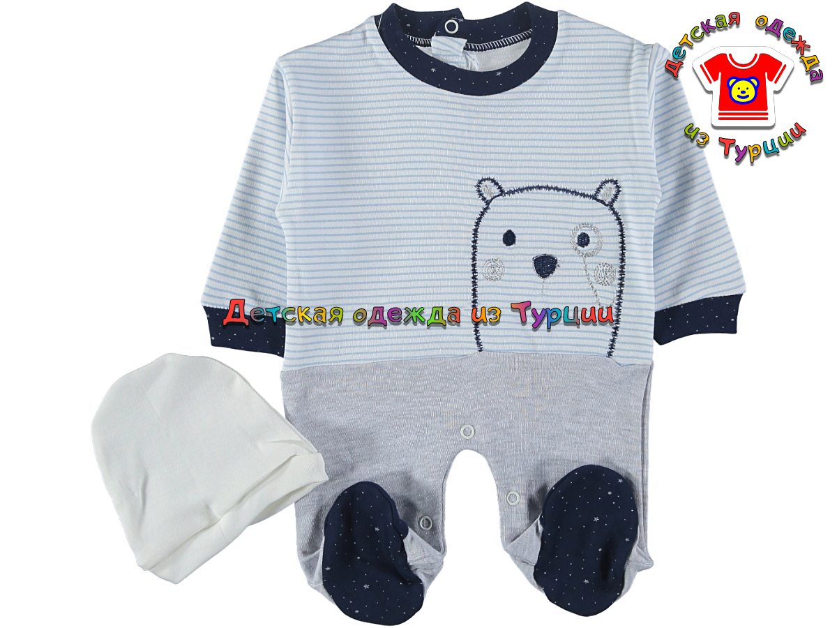 Состав: 100% хлопокСтрана производитель: ТурцияОписание: Комбинезон с рисунком медвежонка, в комплекте шапочка