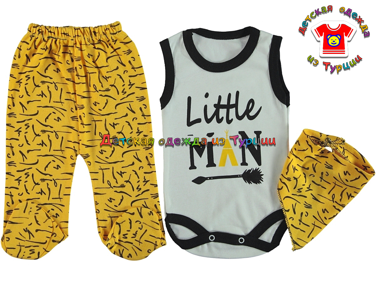 Состав: 100% хлопокСтрана производитель: ТурцияОписание: Комплект для мальчика, с надписью. Шатанишки, боди и нагрудник.