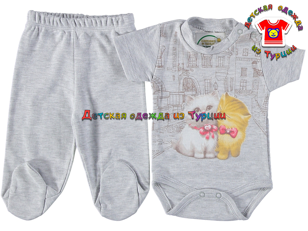 Состав: 100% хлопокСтрана производитель: ТурцияОписание: Комплект для девочки с рисунком котят. Ползунки и боди.