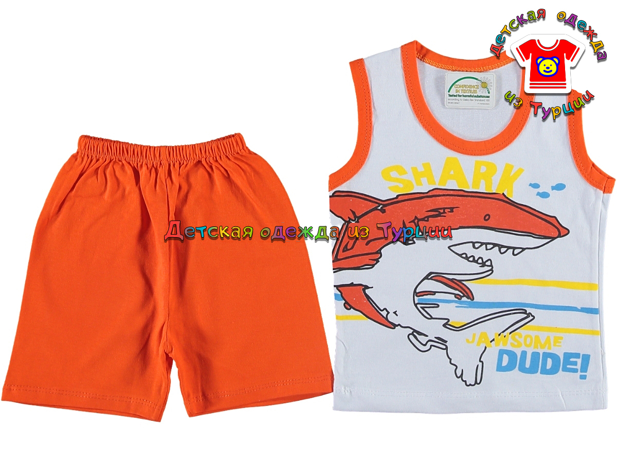 Состав: 100% хлопокСтрана производитель: ТурцияОписание: Костюм для мальчика с рисунком акулы. Шорты и майка.