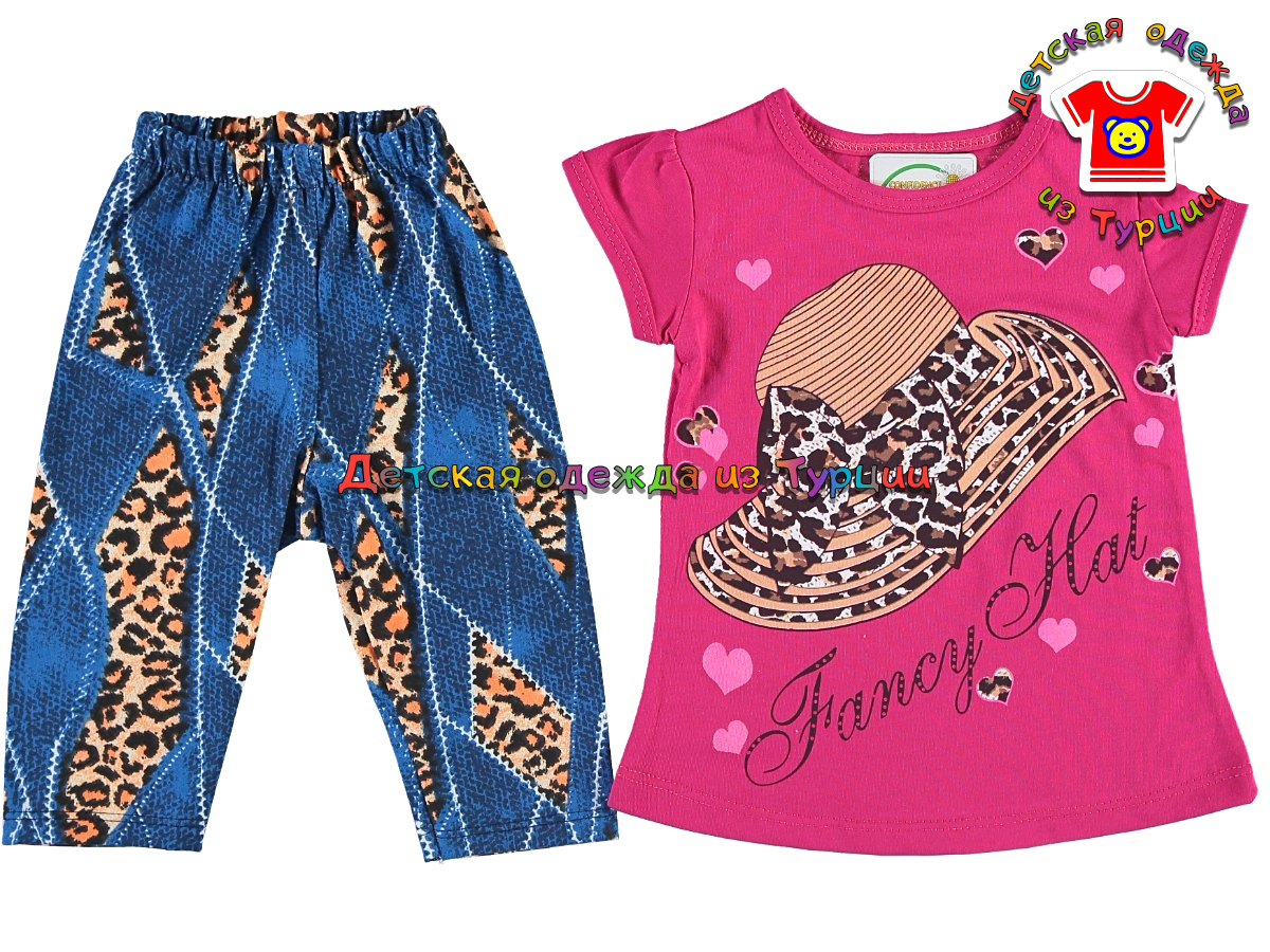 Состав: 100% хлопокСтрана производитель: ТурцияОписание: Костюм для девочки с рисунком шляпки. Лосины и футболка.