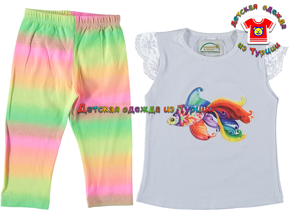 Состав: 100% хлопокСтрана производитель: ТурцияОписание: Костюм с рисунком рыбки. Лосины и футболка.