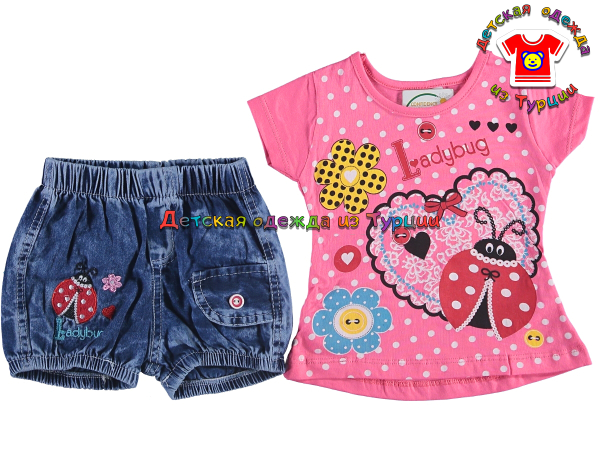 Состав: 100% хлопокСтрана производитель: ТурцияОписание: Костюм для девочки с рисунком. Джинсовые шорты и футболка.