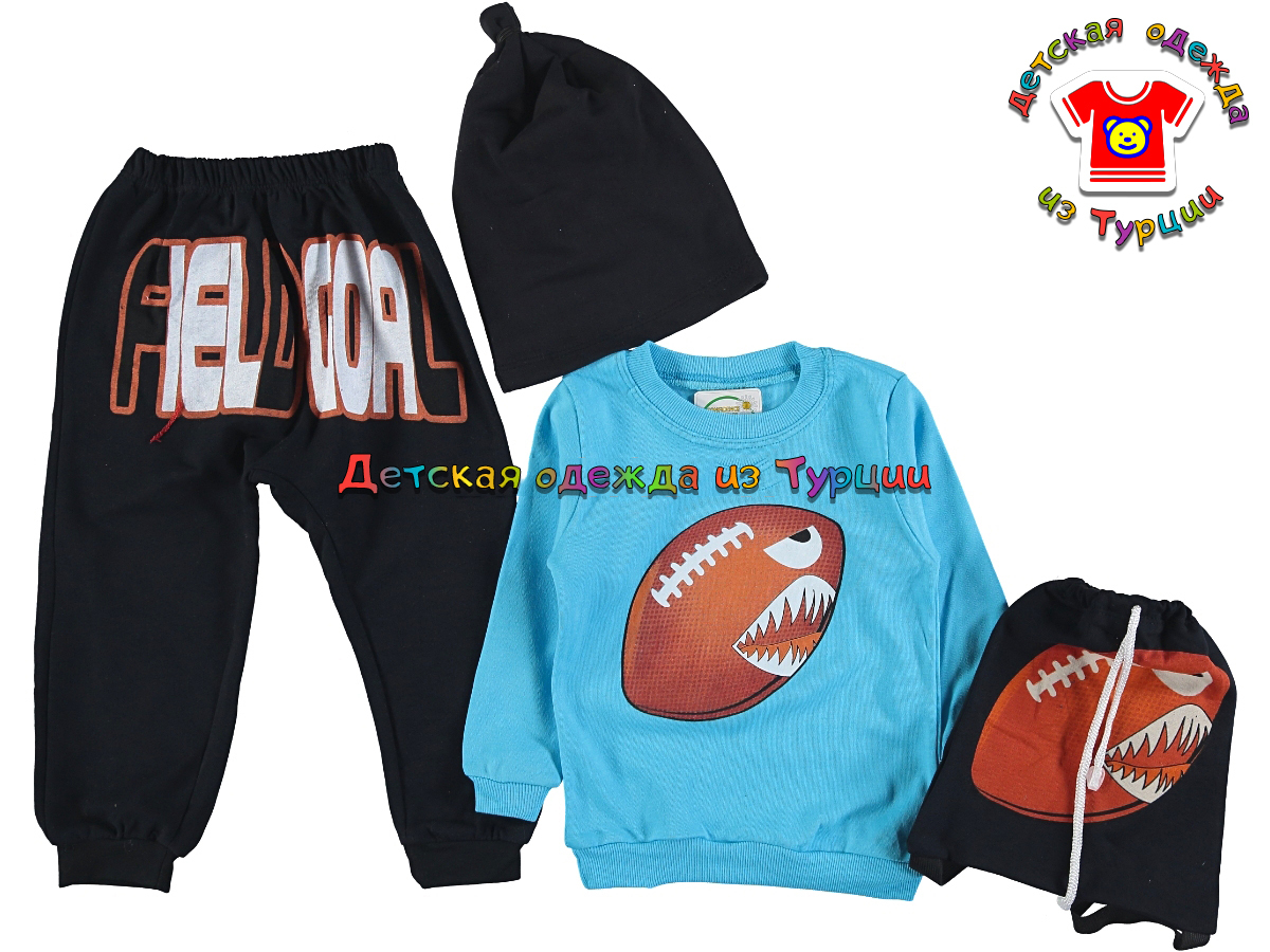 Состав: 100% хлопокСтрана производитель: ТурцияОписание: Костюм для мальчика с рисунком мяча, сумка в комплекте.
