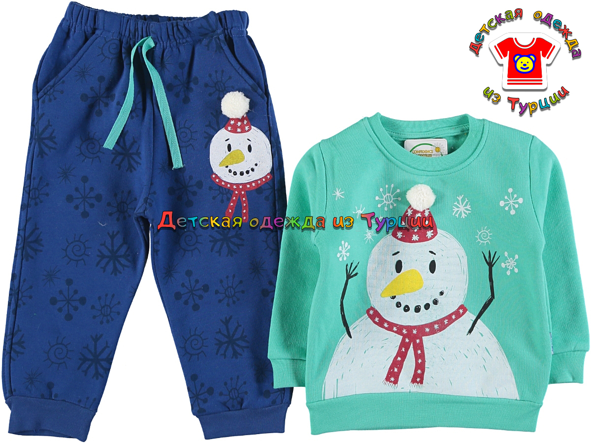 Состав: 100% хлопокСтрана производитель: ТурцияОписание: Костюм с рисунком снеговика утепленный. Кофточка и штанишки.