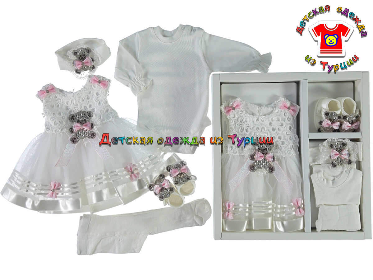 Крестильный набор для девочки из хлопка с темой мишек. В наборе боди, платье, колготки, повязка на голову, пинетки