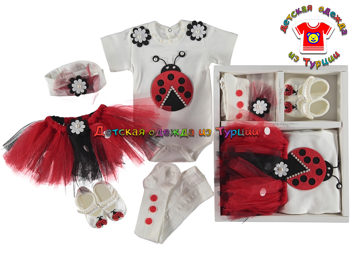 Нарядный набор для девочки из хлопка с рисунком божьей коровки. В наборе боди, юбка, колготки, повязка на голову, пинетки