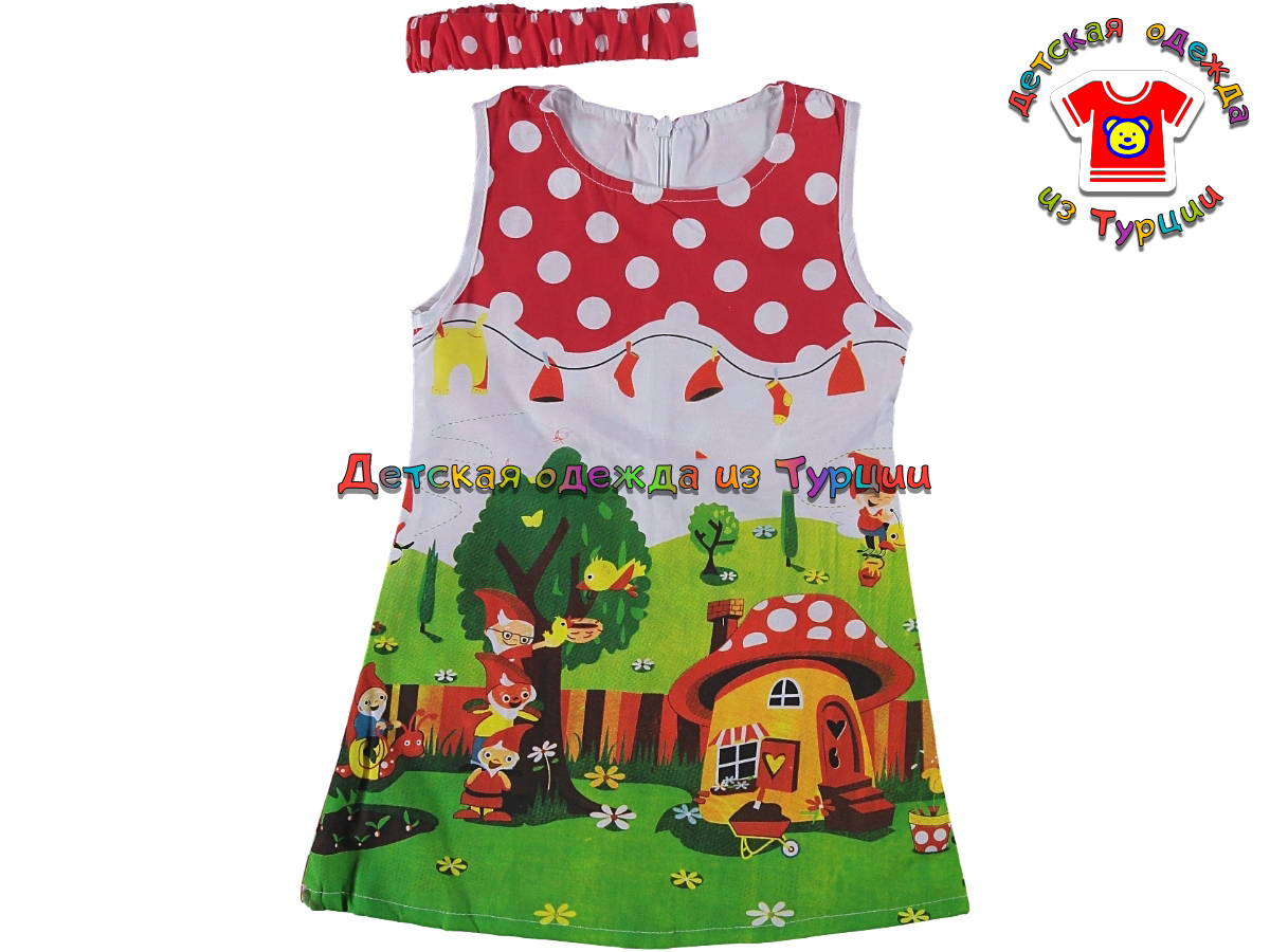 Состав: 100% хлопокСтрана производитель: ТурцияОписание: Сарафан с красочным рисунком, в комплекте повязка на голову.